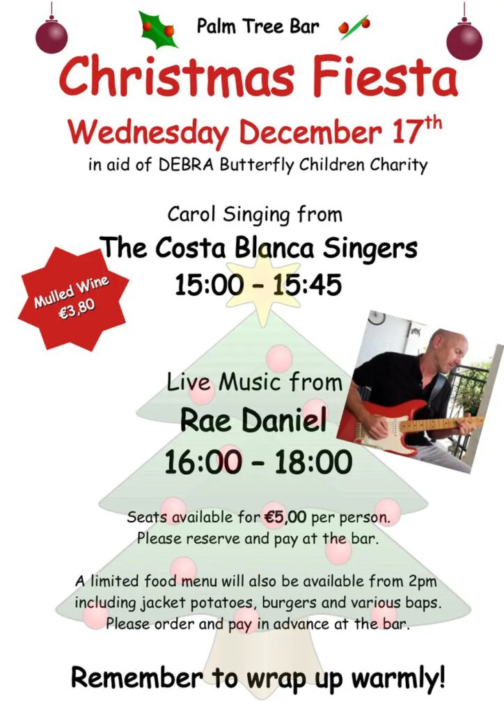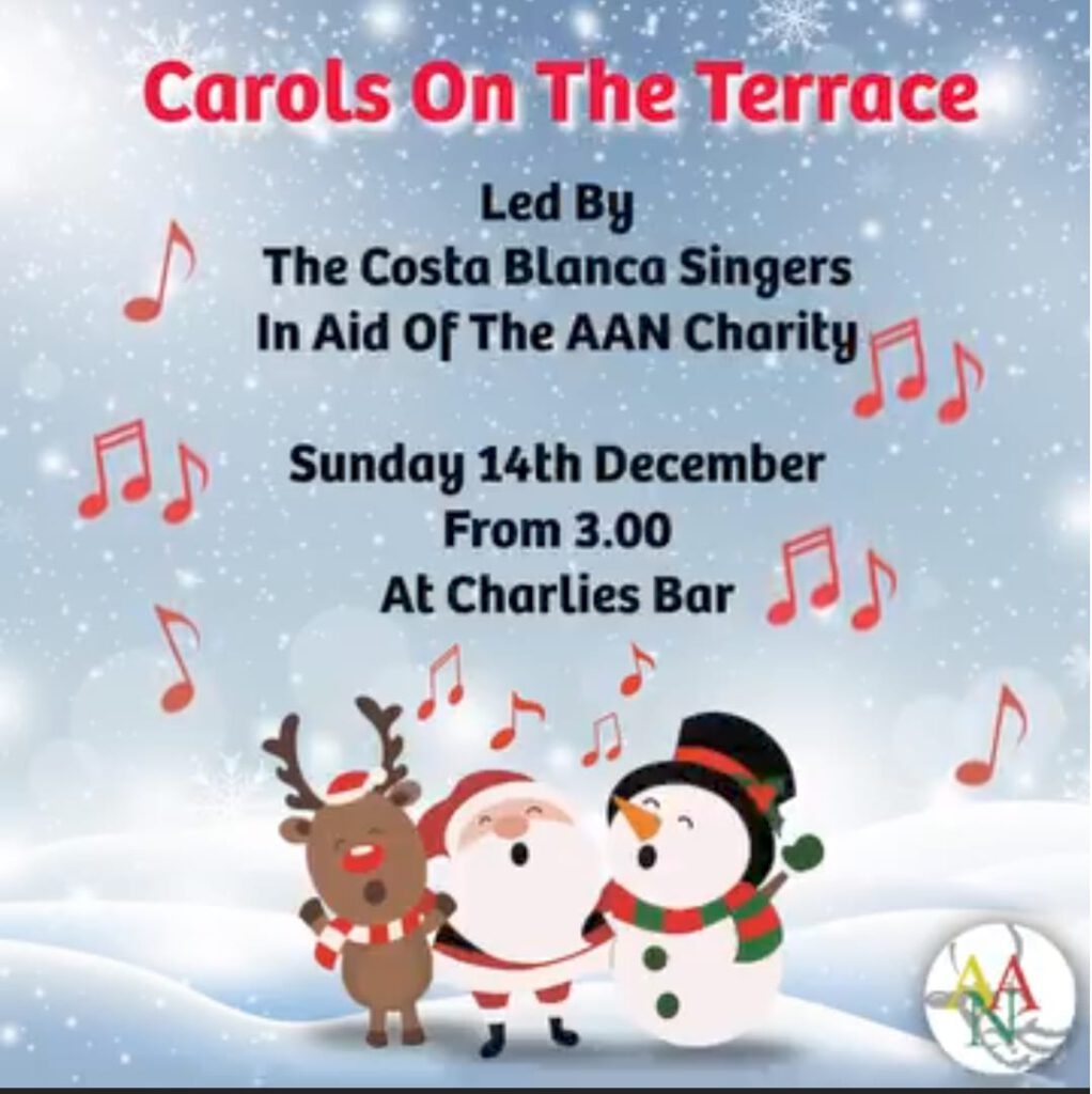 - Sunday 14th December: Charlies Bar, La Marina Urb. from 3:00: Carols on the terrace; Join us in for a Sing-Along afternoon in aid of the AAN charity